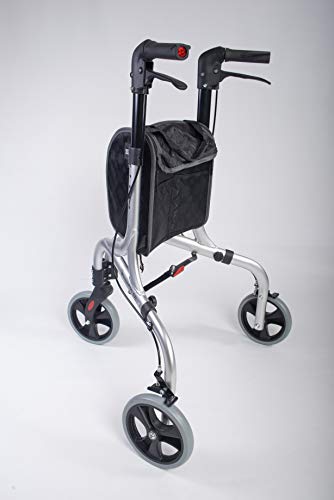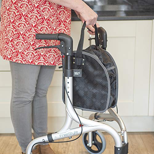 Die drei Räder sorgen für hohe Wendigkeit, während die ergonomisch geformten, höhenverstellbaren Griffe eine angenehme Nutzung ermöglichen. Eine praktische Tasche mit Reißverschluss bietet Platz für persönliche Gegenstände im Alltag.