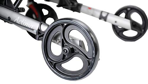 Der stabile Rahmen aus eloxiertem Aluminium sorgt für eine zuverlässige Unterstützung im Alltag und bleibt gleichzeitig angenehm leicht. Mit einem Gewicht von nur etwa 9,1 kg lässt sich der Rollator gut manövrieren und bei Bedarf platzsparend zusammenfalten. Zusammengeklappt ist er nur etwa 32 cm breit und kann daher problemlos transportiert oder verstaut werden.