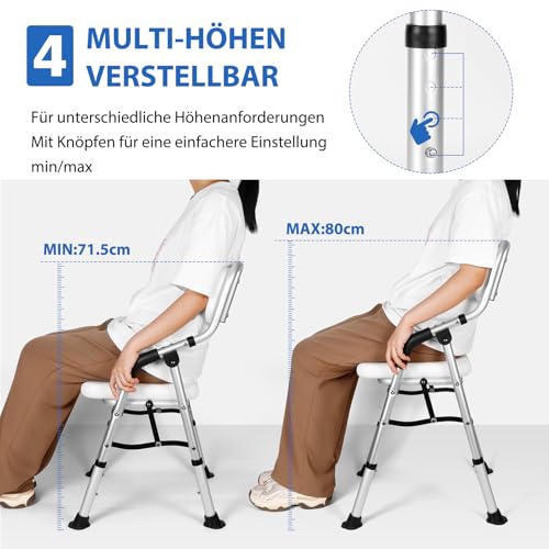 Der faltbare duschstuhl besteht aus einem körper, einer rückenlehne, 4 verstellbaren füßen, 2 abnehmbaren grau EVA-Kissen (sitzkissen, rückenlehnenkissen) für weiche wärme und schnelles trocknen sowie einer duschkopfhalterung.