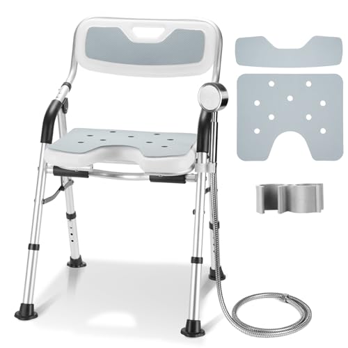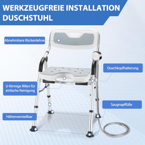 DEWEL Duschstuhl Klappbar mit Rückenlehne und Armlehne, Höhenverstellbarer, Rutschfester Duschsitz mit Duschbrausenhalter – Werkzeugfreie Montage, Tragfähigkeit von 150 kg (Grau)