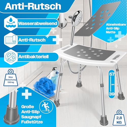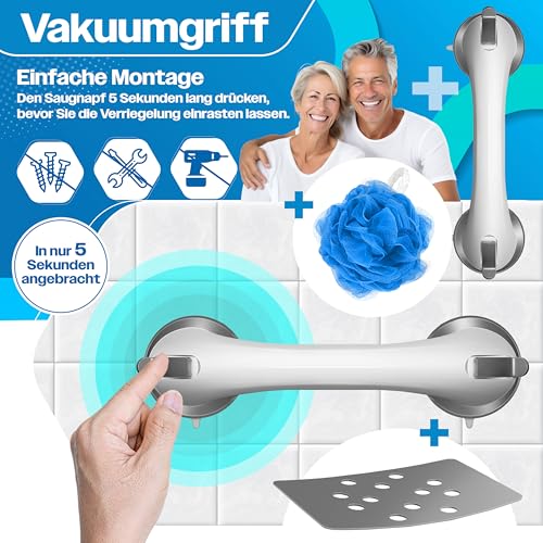 Für maximale Sicherheit verfügt der Duschhocker über eine abnehmbare Anti-Rutsch-Matte sowie eine große Anti-Slip-Saugnapf-Fußstütze, die auch auf glatten und nassen Böden festen Halt bietet. So wird das Risiko von Stürzen deutlich reduziert. Der Vakuum-Haltegriff, der sich im Lieferumfang befindet, kann ohne Werkzeug in wenigen Sekunden angebracht werden und sorgt für zusätzliche Unterstützung beim Ein- und Aussteigen.