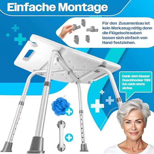Der KESSER® Duschhocker ist die ideale Lösung für alle, die beim Duschen oder Baden zusätzliche Sicherheit, Stabilität und Komfort benötigen. Dank seiner 8-fachen Höhenverstellung von 39 bis 57 cm lässt sich der Hocker flexibel an jede Körpergröße und an individuelle Bedürfnisse anpassen. Trotz seines geringen Eigengewichts von nur 2,8 kg bietet er eine beeindruckende Belastbarkeit von bis zu 136 kg. Damit ist er sowohl für leichtere als auch schwerere Personen optimal geeignet.