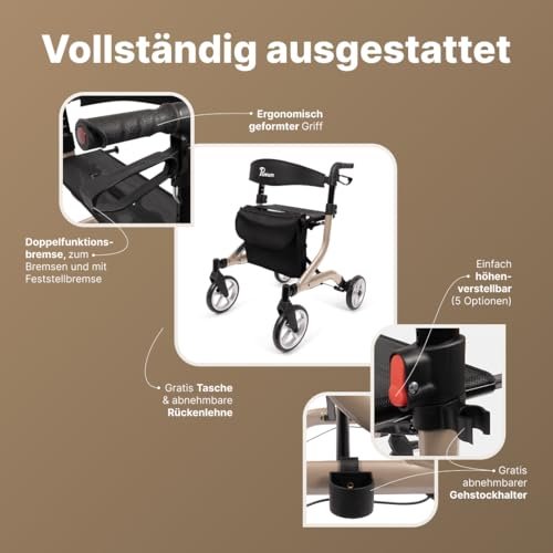 Für den Alltag bietet der Rollator eine komfortable Sitzfläche mit Rückenlehne für kurze Pausen. Zusätzliche Funktionen wie integrierte Bremskabel, Reflektoren und Ankipphilfe sorgen für eine angenehme und sichere Nutzung.