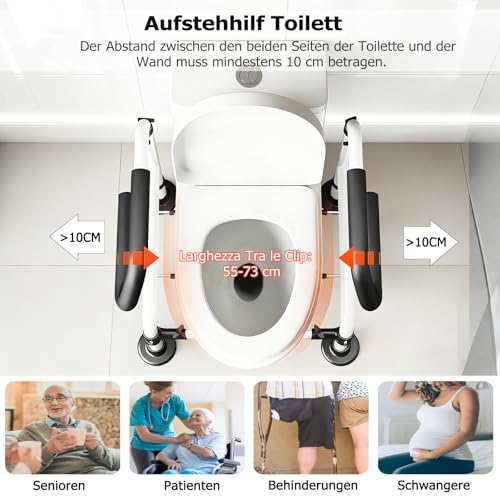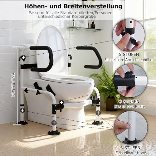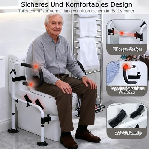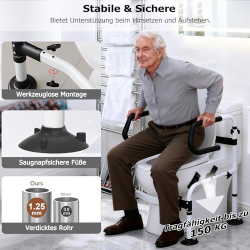 Der verstärkte Rahmen aus Aluminiumlegierung bietet eine Tragkraft bis 150 kg und verbindet Stabilität mit vergleichsweise geringem Eigengewicht. 360° drehbare Clips mit EVA-Polstern fixieren das Gestell sicher an der Toilette, ohne Keramikoberflächen zu beschädigen. Doppelschichtig gepolsterte, rutschfeste Armlehnen sorgen für angenehmen Halt, auch bei Feuchtigkeit. Große Saugnäpfe und rutschhemmende Gummifüße erhöhen zusätzlich die Standfestigkeit auf glatten Böden. Die werkzeuglose Montage ermöglicht eine schnelle Installation und bei Bedarf eine ebenso einfache Demontage – für eine sichere, alltagstaugliche Unterstützung im Badezimmer.
