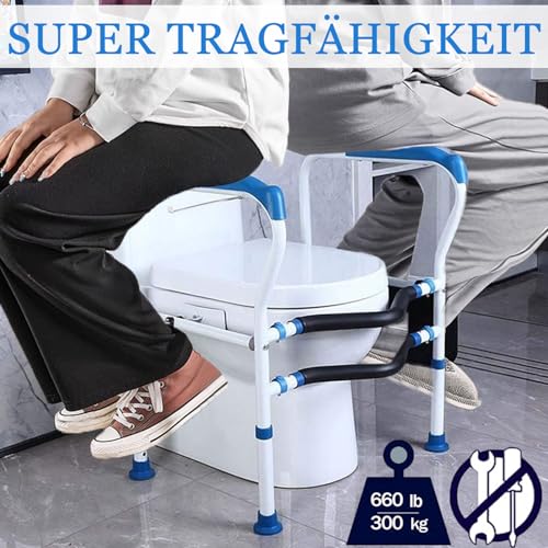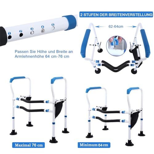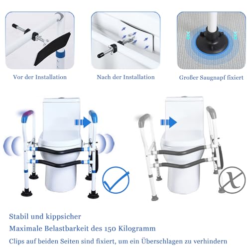 Die stabile Konstruktion aus Kohlenstoffstahl ist wasserdicht, rostfrei und für den täglichen Einsatz konzipiert. Ergonomisch geformte PE-Armlehnen sorgen für einen rutschfesten und angenehmen Griff, selbst bei feuchten Händen. Große Saugnäpfe an den Beinen sowie zusätzliche rutschfeste Gummipuffer erhöhen die Standfestigkeit auf unterschiedlichen Bodenbelägen. Eine integrierte Aufbewahrungstasche bietet Platz für Toilettenpapier oder persönliche Gegenstände. Die gebogene Vorderseite mit Schaumstoffpolster verhindert Druckstellen und sorgt für eine harmonische Anpassung an die Toilette. Damit unterstützt diese Toiletten Aufstehhilfe Sicherheit, Komfort und Selbstständigkeit gleichermaßen.