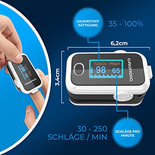 Das GRUNDIG Pulsoximeter wurde für genau diesen Anspruch entwickelt. Es misst die Sauerstoffsättigung im Blut in einem Bereich von 35 % bis 100 % sowie die Pulsfrequenz von 30 bis 250 Schlägen pro Minute. Damit eignet es sich für eine breite Anwendung im Alltag, in der Pflege und zur unterstützenden Kontrolle zuhause. Die Messung erfolgt schmerzfrei direkt am Finger – ohne Blutentnahme und ohne komplizierte Vorbereitung.