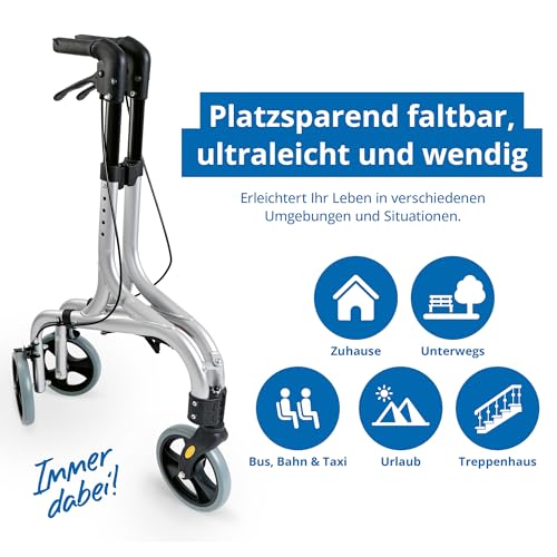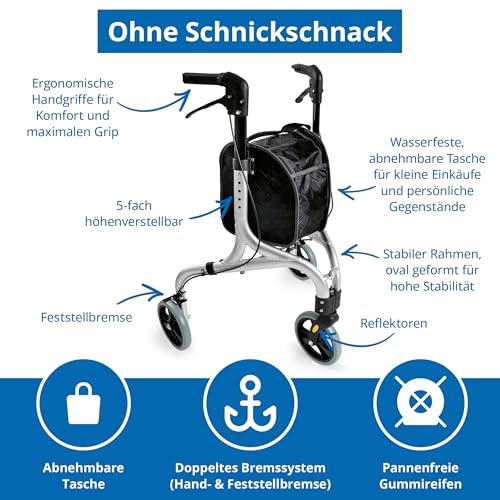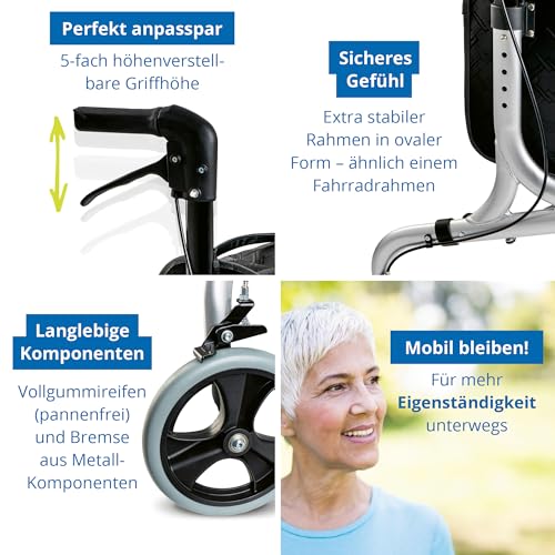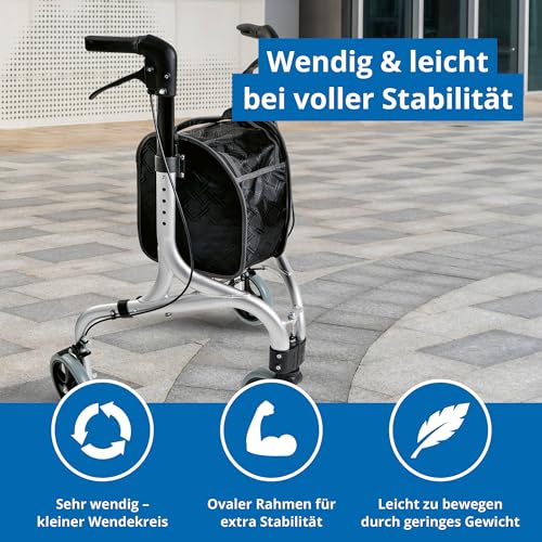 Durch das 3-Rad-Design ist der Rollator sehr wendig und eignet sich ideal für enge Räume, Wohnungen oder kurze Wege im Alltag. Gleichzeitig sorgt der stabile Aluminiumrahmen für zuverlässige Unterstützung.
