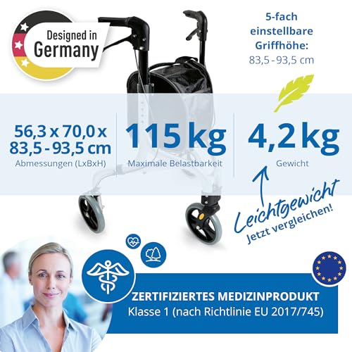 Wenn ein Rollator täglich genutzt wird, spielt das Gewicht eine entscheidende Rolle. Der Weinberger Rollator mit drei Rädern gehört mit nur 4,2 kg zu den besonders leichten Modellen und lässt sich mühelos bewegen und transportieren.