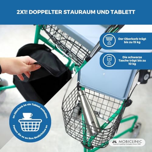 Besonders praktisch ist die Ausstattung: Ein Korb mit Deckel sowie eine zusätzliche Tasche bieten ausreichend Stauraum für Einkäufe oder persönliche Gegenstände. Die ergonomischen, höhenverstellbaren Griffe sorgen für eine angenehme Handhabung.