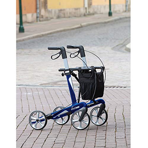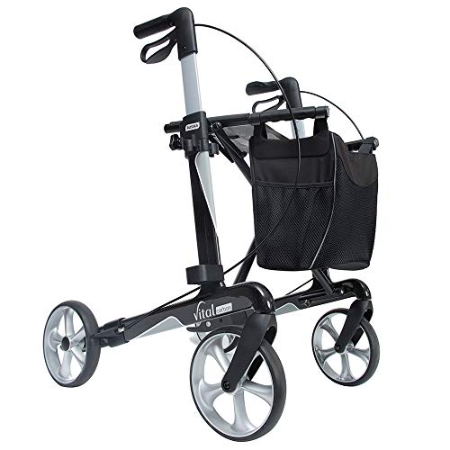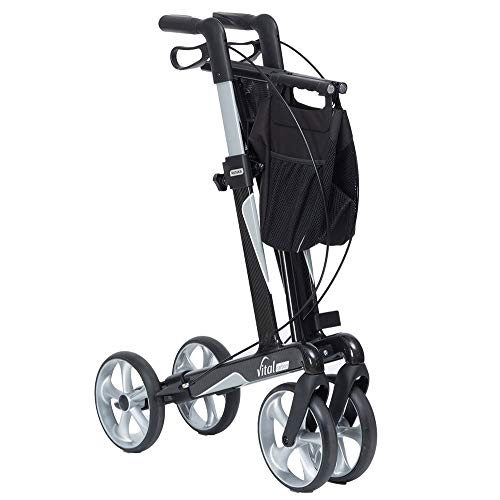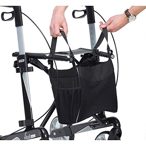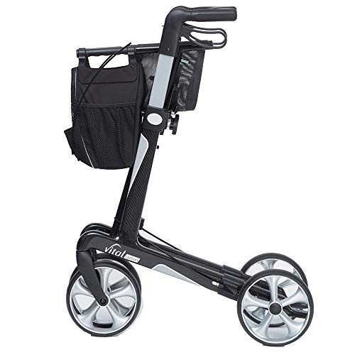 Leichtgewicht-Rollator Vital carbon Der Leichtgewicht-Rollator Vital carbon ist genau der richtige Begleiter, wenn Sie einen besonders leichten Rollator verwenden möchten. Mit seinen 5,8 kg (ohne Zubehör) zählt er zu den leichtesten Rollatoren. Der Vital carbon ist eine Weiterentwicklung des Rollators Vital und beinhaltet alle Vorteile des Testsiegers (Stiftung Warentest 2014) in Kombination eines besonders leichten Rahmens. Zum Lieferumfanfg des Rollators gehören eine Stockhalterung sowie die geräumige und bis zu 5 kg belastbare Tragetasche. Die Taschenhalterung dient gleichzeitig auch als praktischer Tragegriff für den gefalteten Rollator. Der Rollator lässt sich zudem besonders einfach zusammenklappen, so dass er in jedem Flur, Kofferraum oder anderen Orten Platz findet. Der Vital carbon ist in der Sitzhöhe 62 cm erhältlich. Dank der ergonomischen Handgriffe können Sie auch längere Strecken mit dem Rollator Vital bestreiten. Diese passen sich optimal an und bieten Sicherheit mit der zu verwendenden Schlaufenbremse. Die Bremse kann als Festsell- und Betriebsbremse verwendet werden. Die Nummerierung an den Haltegriffen erleichtert das Wiederfinden der richtigen Höheneinstellung. Die Stufenhilfen an den Hinterrädern ermöglichen ein leichtes Überwinden von Schwellen und Bordsteinen. Abmessungen Breite: 60 cm Länge: 66 cm Schiebegriffe: 74 – 102 cm Sitzhöhe: 62 cm Faltmaß: 22 x 66 x 74-101,5 cm Technischen Daten Belastbarkeit: 150 kg Tasche: Material: 100 % Polyester / Maße: 32 x 15 x 28 cm (B x L x H) Gewicht: 5,8 kg