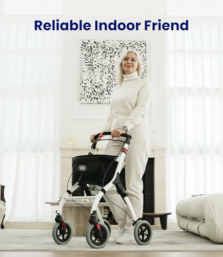 Gefertigt aus robuster Aluminiumlegierung wiegt der Rollator nur 6,6 kg und ist dennoch bis 110 kg belastbar. Das elegante Bogen-Design mit Doppelrohr-Stütze sorgt für hohe Stabilität ohne Wackeln. Für maximalen Komfort verfügt der weiche Schaumgriff über eine rutschfeste Oberfläche und lässt sich in 5 Stufen anpassen – ideal für Personen von 150 bis 190 cm Körpergröße.